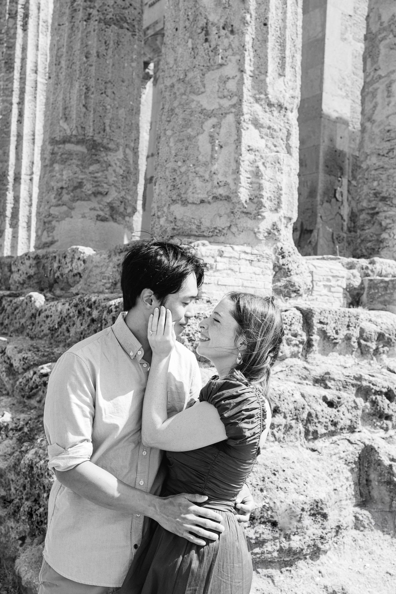 Kevin and Safia’s proposal took place as the sun cast a warm glow over the temples. The historic columns created a dramatic yet intimate backdrop, making every photograph feel like a scene from a romantic film.